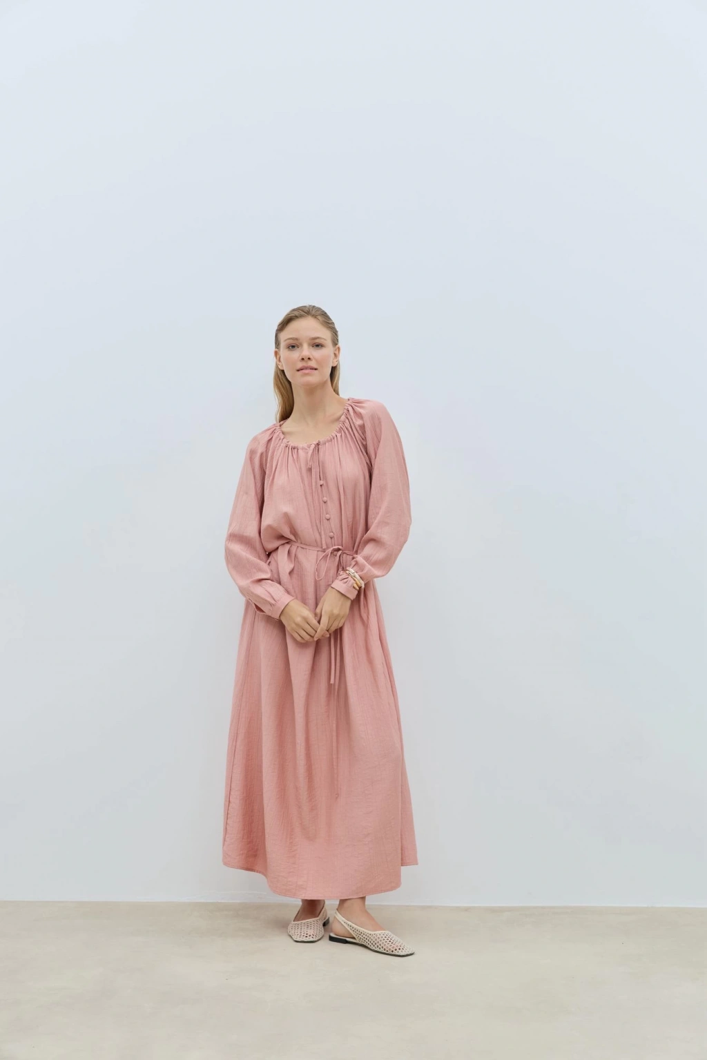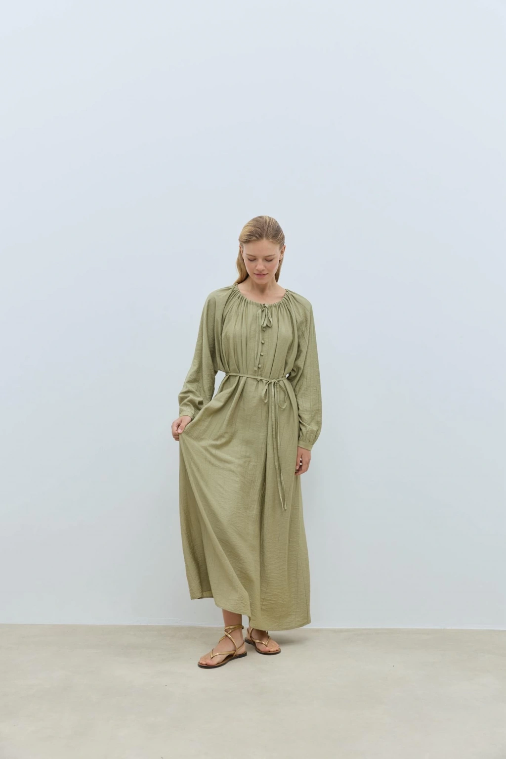 Düğmeli Balon Kol Çağla Yeşili Elbise
