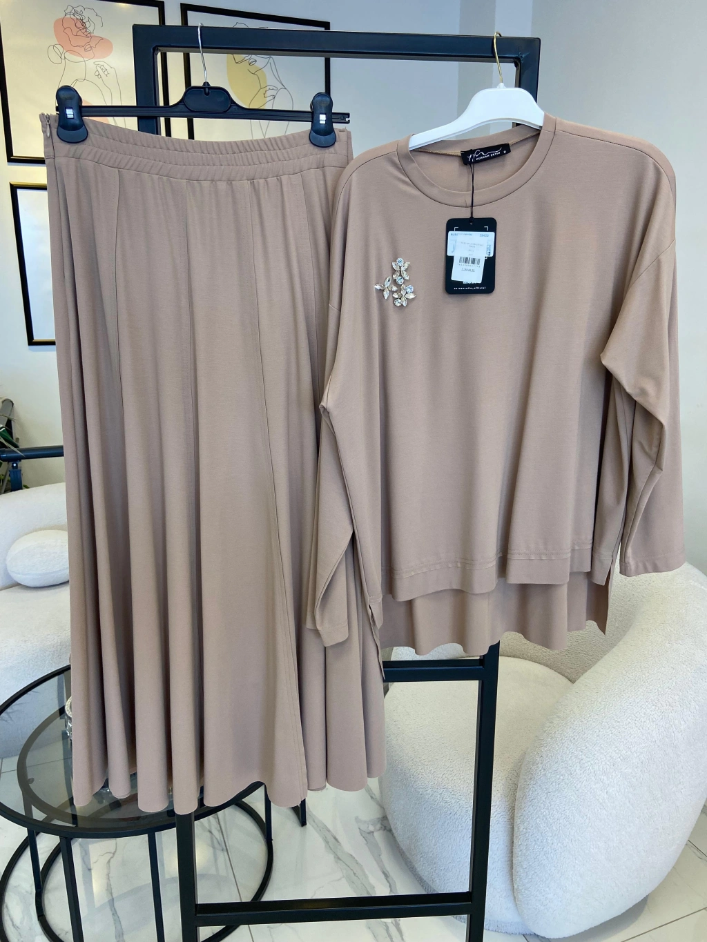 NURCAN ÇETİN FİYONK DETAYLI ETEKLİ TAKIM KAHVERENGİ