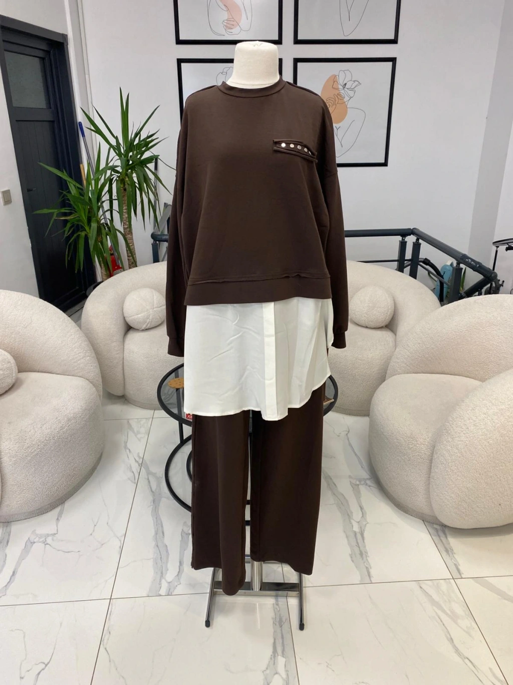NURCAN ÇETİN ŞİFON DETAYLI İKİLİ TAKIM KAHVERENGİ