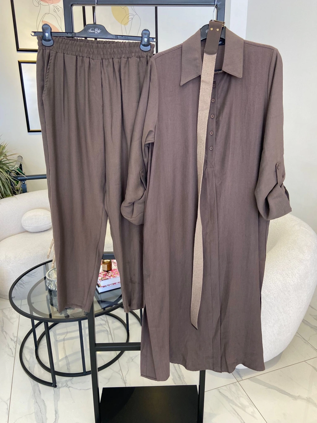 NURCAN ÇETİN ŞİFON DETAYLI İKİLİ TAKIM KAHVERENGİ