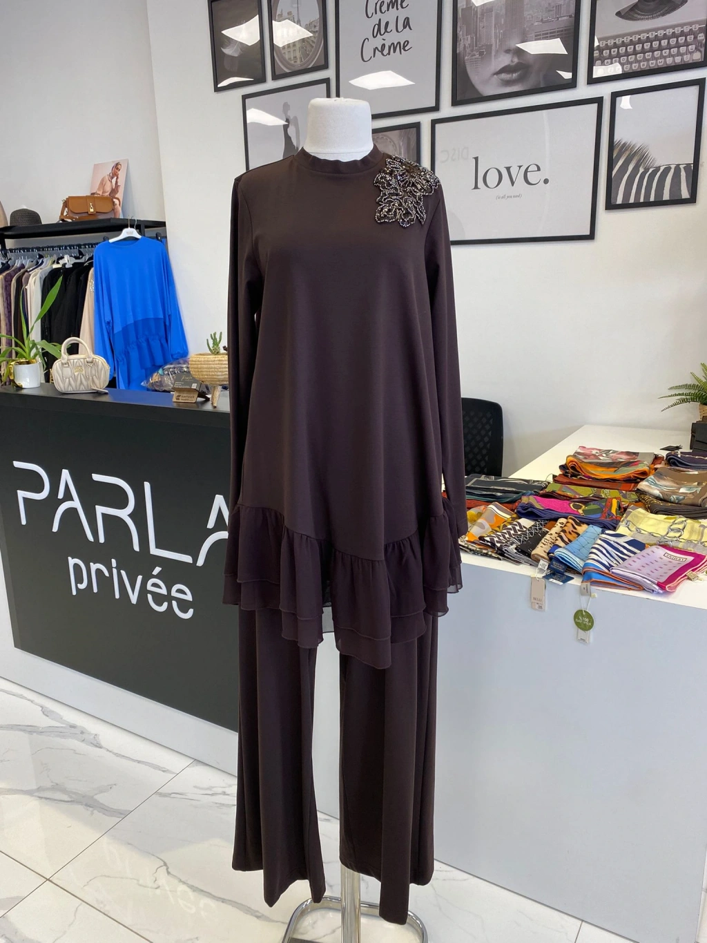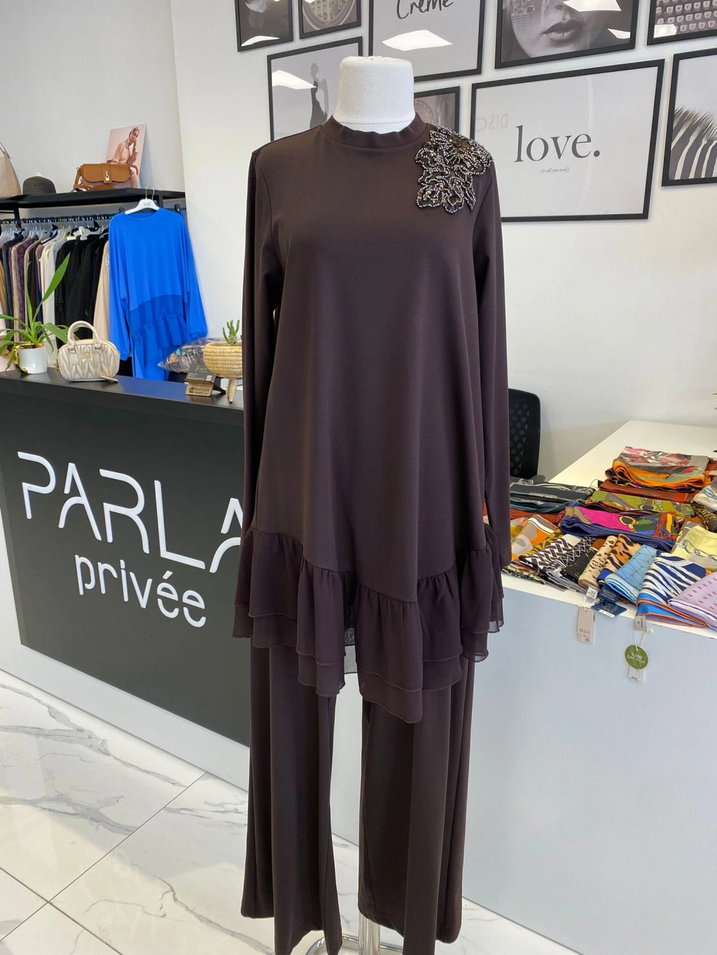 NURCAN ÇETİN FİYONK DETAYLI ETEKLİ TAKIM KAHVERENGİ