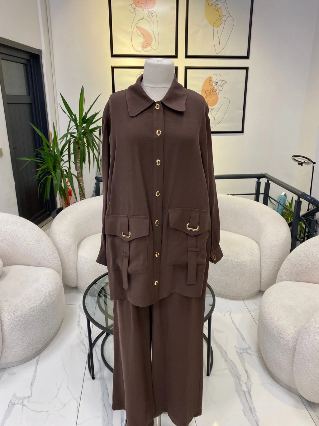 NURCAN ÇETİN ŞİFON DETAYLI İKİLİ TAKIM KAHVERENGİ