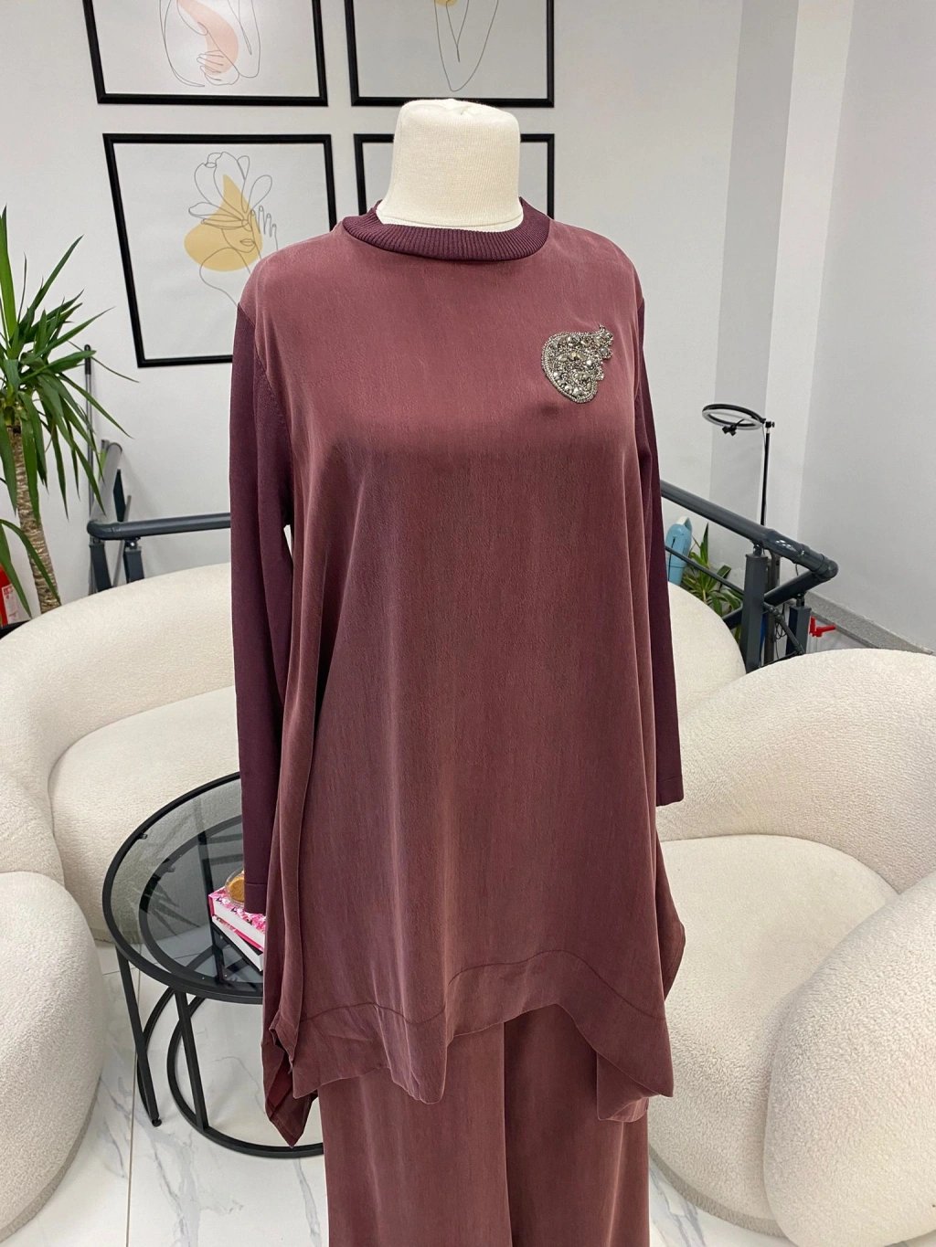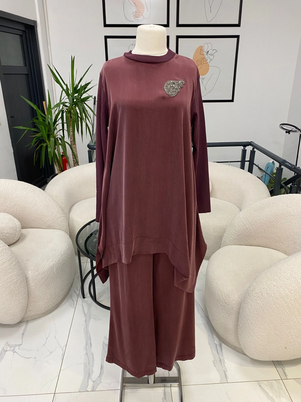 NURCAN ÇETİN ŞİFON DETAYLI İKİLİ TAKIM KAHVERENGİ